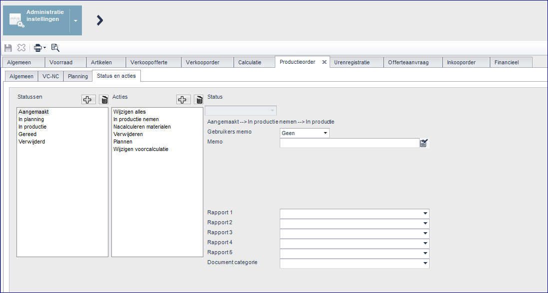 Onderstaande tabel geeft de standaard inrichting weer van de statussen en acties in het productieorderproces. De bronstatus is de status, waarin het proces zich bevindt. De doelstatus is de status waarin het proces overgaat na uitvoering van de actie. Een doelstatus dient - met uitzondering van de eindstatus - tevens als bronstatus opgenomen te worden.