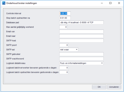 If the service is running, you can log in to MKG. Start the module Batch Commands. Check the settings in this module and adjust them if necessary. Click on the Broker Settings button