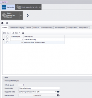 Bij het tabblad ‘Offerte’ staan alle verkoopofferte layouts die zijn ingesteld. In dit geval onder de kolom ‘Offerte layout’ staat: 1. En de Omschrijving die daarbij hoort: Offerte De Koning. In het detailvenster zie je aan welke rapportdefinitie Offerte De Koning (1) is gekoppeld, in dit geval gekoppeld aan De Koning Verkoopofferte (24) en de Doel structuur Export (PDF).