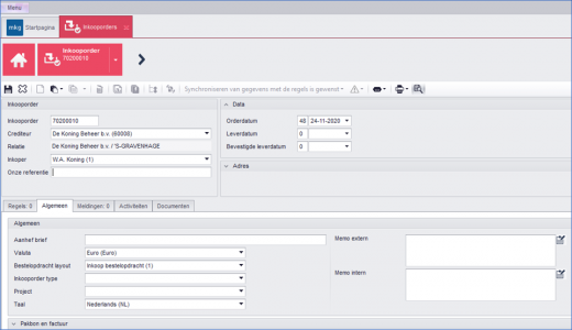 Als je bijvoorbeeld een inkooporder opent in de module Inkooporders, zie je onder het tabblad 'Algemeen' het veld Bestelopdracht layout. Dit is de layout, zoals je het hebt ingesteld in de rapportdefinitie.