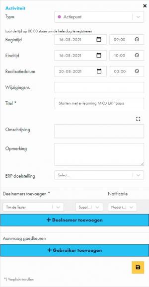 Via de knop Gebruiker toevoegen kun je eventueel een collega toevoegen die deze activiteit moet accorderen.