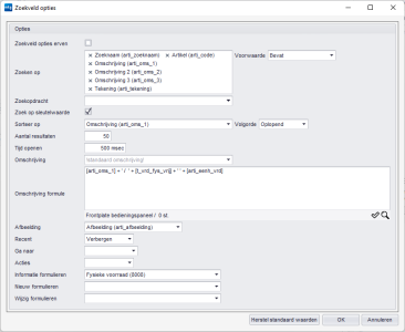 | 5 | To show the free physical inventory of this item, we need to include this table in the formula: enter a square bracket "[" and select the 'Physical Inventory Free Stock' field in the list that appears. The second part of the formula is shown: [arti_oms_1] + ' / ' + [t_vrd_fys_vrij] |